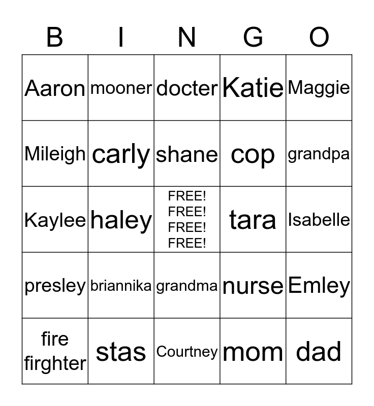 This bingo card has a free space and 24 words: briannika, stas, shane, fire firghter, Maggie, Aaron, Mileigh, mooner, tara, grandma, cop, Kaylee, nurse, Emley, carly, mom, Isabelle, docter, grandpa, haley, dad, presley, Katie and Courtney.