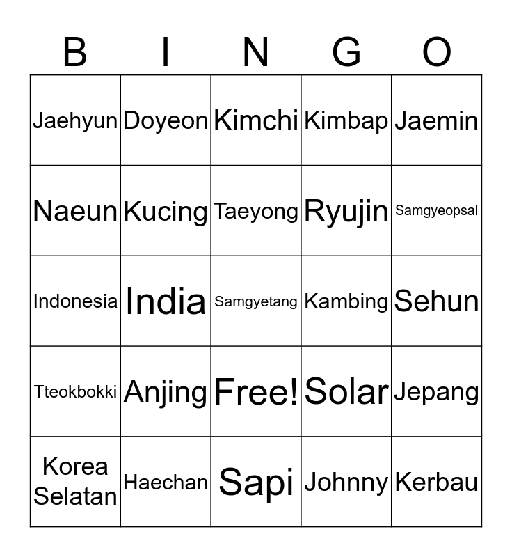 This bingo card has 26 words: Free!, Johnny, Taeyong, Haechan, Jaemin, Jaehyun, Naeun, Doyeon, Sehun, Solar, Ryujin, Indonesia, Jepang, Korea Selatan, India, China, Kimbap, Tteokbokki, Kimchi, Samgyetang, Samgyeopsal, Sapi, Kambing, Anjing, Kucing and Kerbau.