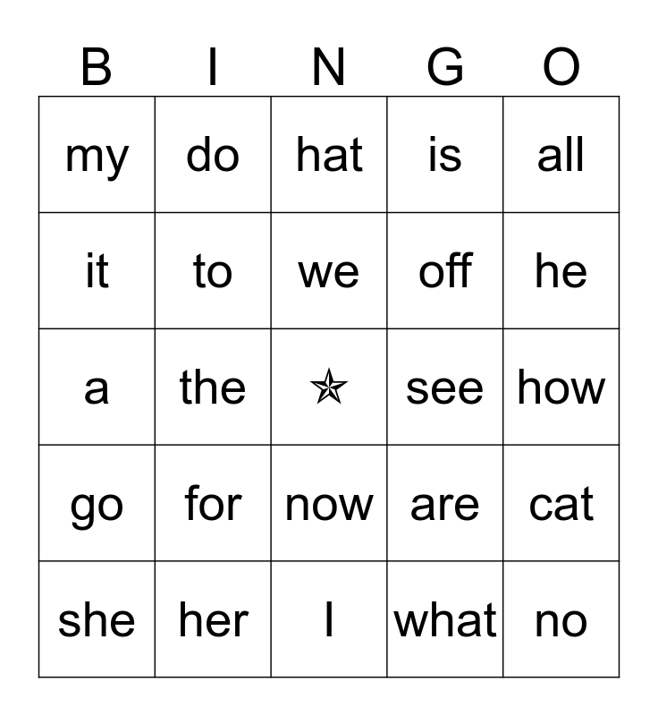 This bingo card has a free space and 29 words: she, me, the, be, my, hat, to, for, see, her, how, no, I, what, he, you, now, go, all, a, are, and, off, it, is, do, cat, we and here.