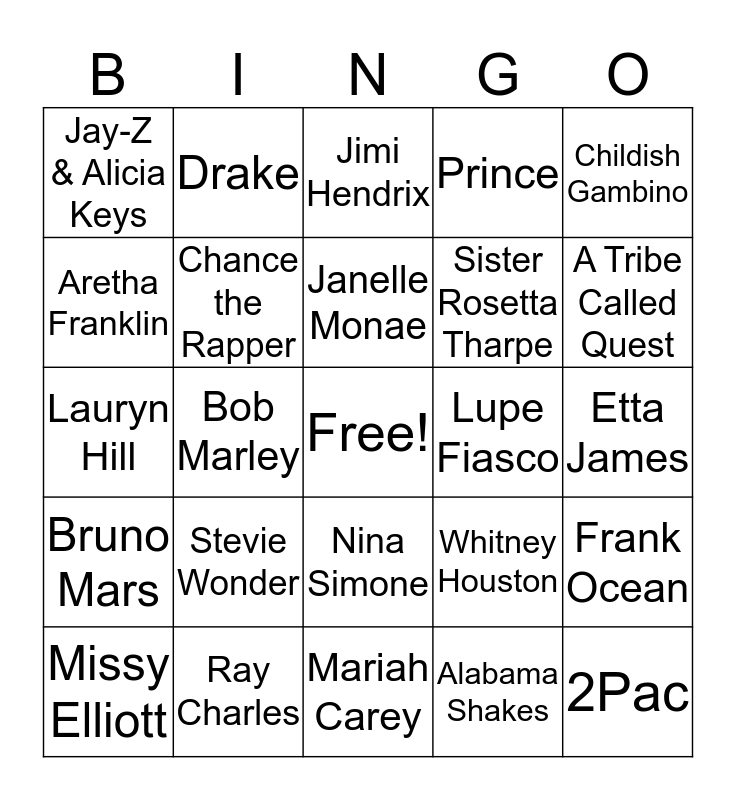 This bingo card has a free space and 32 words: Alabama Shakes, Alicia Keys, Bob Marley, Beyonce, Bruno Mars, Chance the Rapper, Childish Gambino, Frank Ocean, Drake, Gary Clark Jr, Janelle Monae, Jimi Hendrix, Kendrick Lamar, Kid Cudi, Lupe Fiasco, Michael Jackson, Missy Elliott, Lauryn Hill, Nina Simone, Stevie Wonder, Whitney Houston, Lizzo, Etta James, Ray Charles, 2Pac, Prince, Sister Rosetta Tharpe, Aretha Franklin, Jay-Z & Alicia Keys, Mariah Carey, Solange and A Tribe Called Quest.