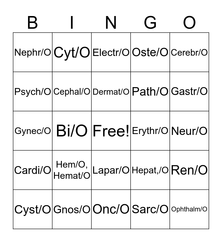 This bingo card has a free space and 33 words: Aden/O, Arth/O, Bi/O, Carcin/O, Cardi/O, Cephal/O, Cerebr/O, Cyst/O, Cyt/O, Derm/O, Dermat/O, Electr/O, Encephal/O, Enter/O, Erythr/O, Gastr/O, Gnos/O, Gynec/O, Hem/O, Hemat/O, Hepat,/O, Lapar/O, Leuk/O, Nephr/O, Neur/O, Onc/O, Ophthalm/O, Oste/O, Path/O, Psych/O, Ren/O, Rhin/O, Sarc/O and Thromb/O.