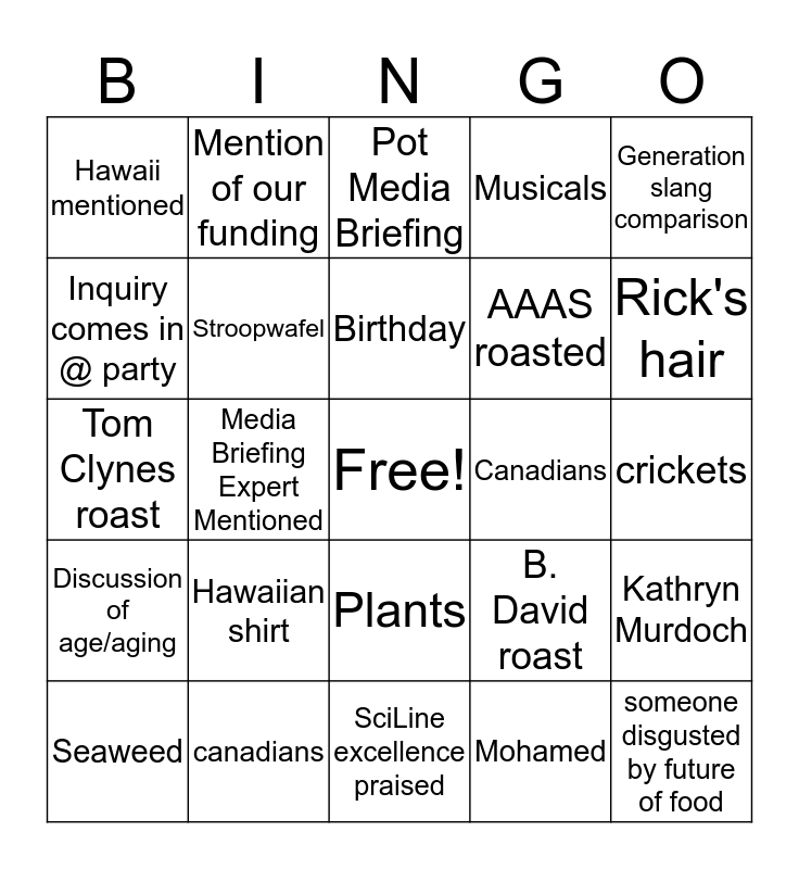 This bingo card has a free space and 29 words: Seaweed, Hot Cheetos, Media Briefing Expert Mentioned, Mohamed fills inquiry @ party, Hawaii mentioned, Pot Media Briefing, Stroopwafel, Hawaiian shirt, Canadians, canadians, crickets, someone disgusted by future of food, SciLine excellence praised, Mohamed, Rick's hair, Minnesota, Plants, Discussion of age/aging, Generation slang comparison, Tom Clynes roast, B. David roast, #Ambush@theHyatt, AAAS roasted, Inquiry comes in @ party, Musicals, Mention of our funding, Kathryn Murdoch, Birthday and ice cubes or freezer.