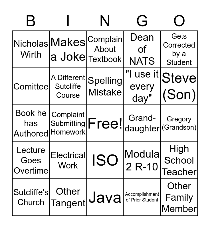 This bingo card has a free space and 24 words: Electrical Work, Other Tangent, Spelling Mistake, Sutcliffe's Church, Gets Corrected by a Student, Nicholas Wirth, Comittee, Makes a Joke, Grand-daughter, ISO, "I use it every day", Book he has Authored, Modula 2 R-10, High School Teacher, A Different Sutcliffe Course, Accomplishment of Prior Student, Gregory (Grandson), Complain About Textbook, Steve (Son), Complaint Submitting Homework, Other Family Member, Lecture Goes Overtime, Dean of NATS and Java.