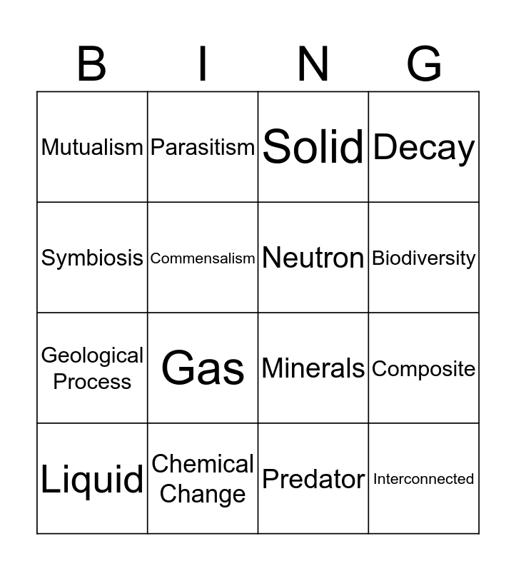 This bingo card has 26 words: Free!, Diversity, Biodiversity, Ecosystem, Symbiosis, Mutualism, Commensalism, Parasitism, Predator, Prey, Geological Process, Minerals, Fossil Fuel, Synthetic, Composite, Climate, Decay, Interconnected, Solid, Liquid, Gas, Physical Change, Chemical Change, Protons, Neutron and Electron.