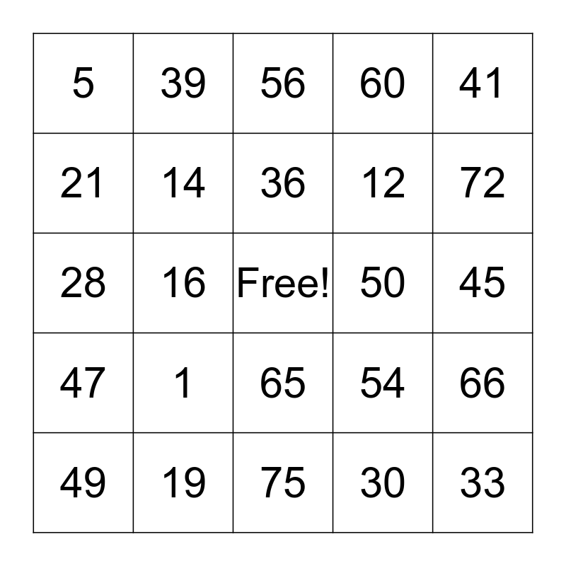 This bingo card has a free space and 24 words: 1, 19, 36, 49, 41, 5, 21, 39, 50, 65, 12, 28, 54, 66, 14, 30, 45, 56, 72, 16, 33, 47, 60 and 75.