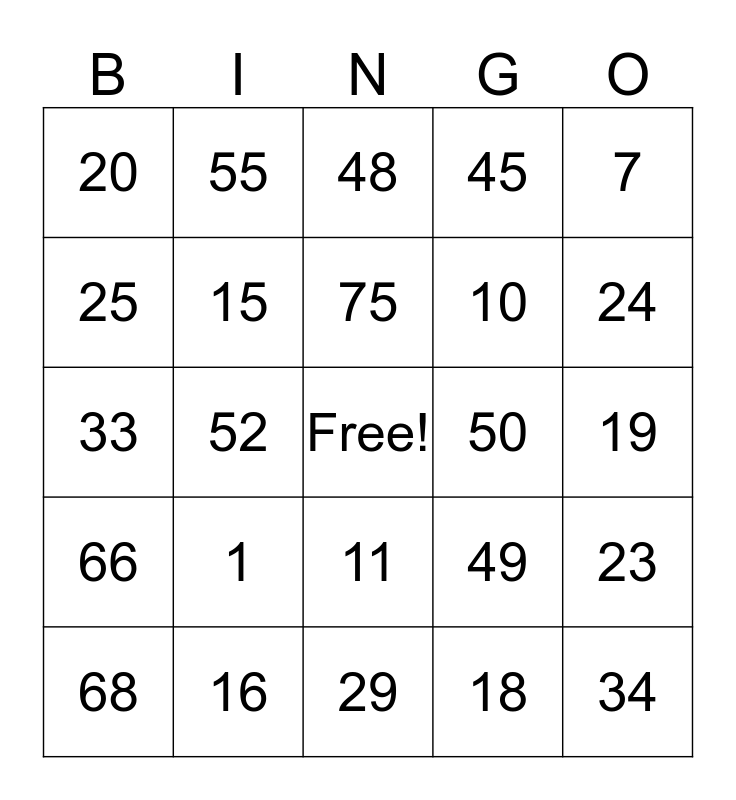 This bingo card has a free space and 24 words: 1, 16, 75, 68, 7, 20, 25, 55, 50, 11, 10, 33, 49, 23, 15, 18, 19, 48, 24, 52, 34, 66, 45 and 29.