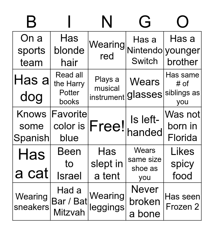 This bingo card has a free space and 24 words: Been to Israel, Had a Bar / Bat Mitzvah, Plays a musical instrument, Wearing sneakers, Has a younger brother, On a sports team, Has a dog, Has blonde hair, Is left-handed, Has slept in a tent, Wears glasses, Knows some Spanish, Wears same size shoe as you, Likes spicy food, Read all the Harry Potter books, Never broken a bone, Was not born in Florida, Wearing red, Has same # of siblings as you, Favorite color is blue, Has seen Frozen 2, Has a cat, Has a Nintendo Switch and Wearing leggings.