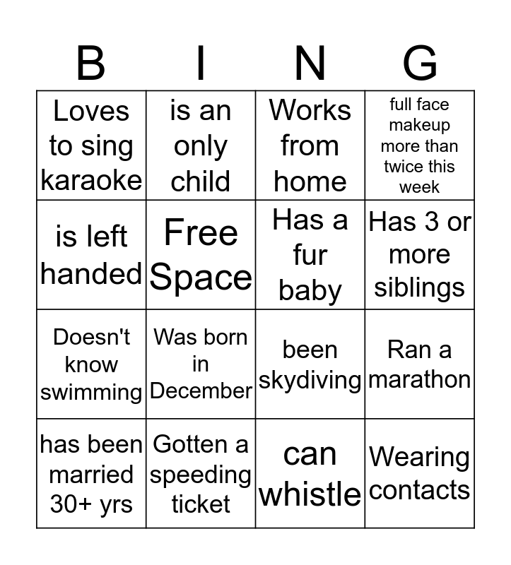 This bingo card has 16 words: Gotten a speeding ticket, Ran a marathon, Works from home, Loves to sing karaoke, Doesn't know swimming, is an only child, been skydiving, can whistle, is left handed, Free Space, has been married 30+ yrs, full face makeup more than twice this week, Was born in December, Has 3 or more siblings, Has a fur baby and Wearing contacts.