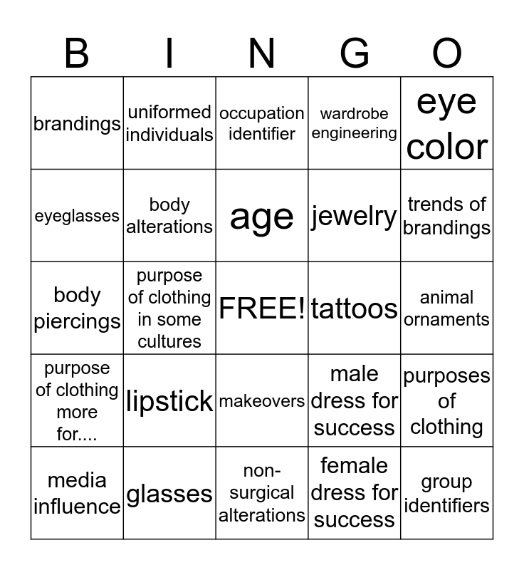 This bingo card has a free space and 24 words: lipstick, glasses, age, media influence, eye color, brandings, eyeglasses, uniformed individuals, tattoos, makeovers, jewelry, body piercings, male dress for success, purposes of clothing, body alterations, female dress for success, animal ornaments, occupation identifier, trends of brandings, purpose of clothing in some cultures, group identifiers, purpose of clothing more for...., wardrobe engineering and non-surgical alterations.