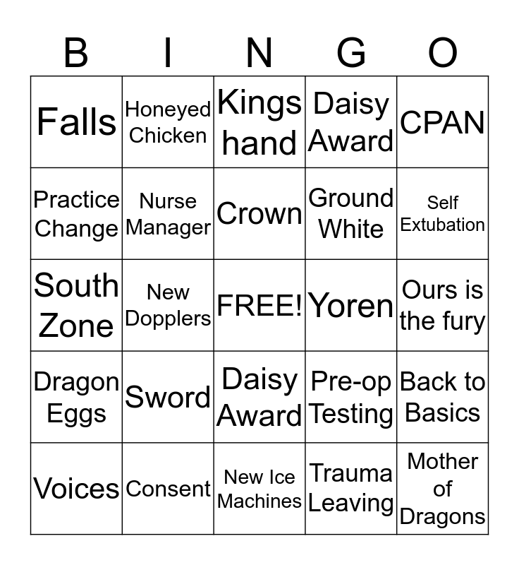 This bingo card has a free space and 24 words: Sword, Consent, Crown, Voices, CPAN, Falls, Practice Change, Honeyed Chicken, Yoren, Daisy Award, Ground White, South Zone, Pre-op Testing, Back to Basics, Nurse Manager, Trauma Leaving, Ours is the fury, Kings hand, Self Extubation, New Dopplers, Mother of Dragons, Dragon Eggs, Daisy Award and New Ice Machines.