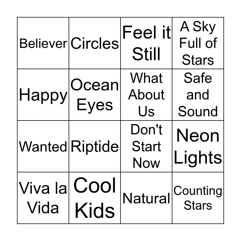 This bingo card has 33 words: High Hopes, Shallow, Neon Lights, Whatever it takes, Counting Stars, What About Us, Happy, Thunder, Circles, Free!, Safe and Sound, Feel it Still, Stitches, Pompeii, Cool Kids, Riptide, Memories, Don't Start Now, Nice to Meet Ya, Lover, Talk, Live Forever, Believer, Natural, Something Just Like This, Viva la Vida, A Sky Full of Stars, Wanted, Ocean Eyes, Dance Monkey, Someone you Loved, Trampoline and Graveyard.