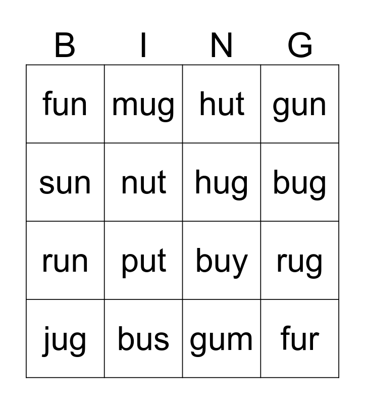 This bingo card has 16 words: bus, rug, hut, fun, run, mug, buy, gum, sun, nut, jug, gun, put, bug, hug and fur.