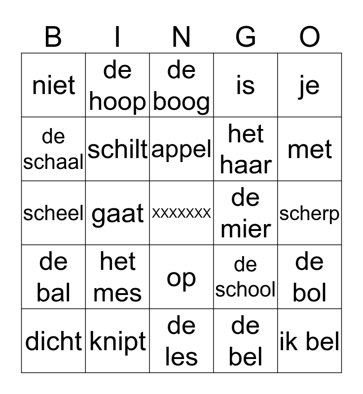 This bingo card has a free space and 27 words: de school, de nek, het haar, de les, de schaal, de boog, de hoop, de bal, de mier, de bol, scheel, is, dicht, knipt, met, schaar, schilt, appel, het mes, niet, scherp, de bel, gaat, ik bel, op, je and snel.