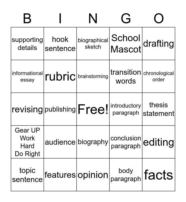 This bingo card has a free space and 24 words: audience, features, brainstorming, topic sentence, drafting, supporting details, informational essay, hook sentence, introductory paragraph, biography, transition words, revising, conclusion paragraph, editing, rubric, body paragraph, thesis statement, biographical sketch, chronological order, publishing, facts, Gear UP Work Hard Do Right, School Mascot and opinion.