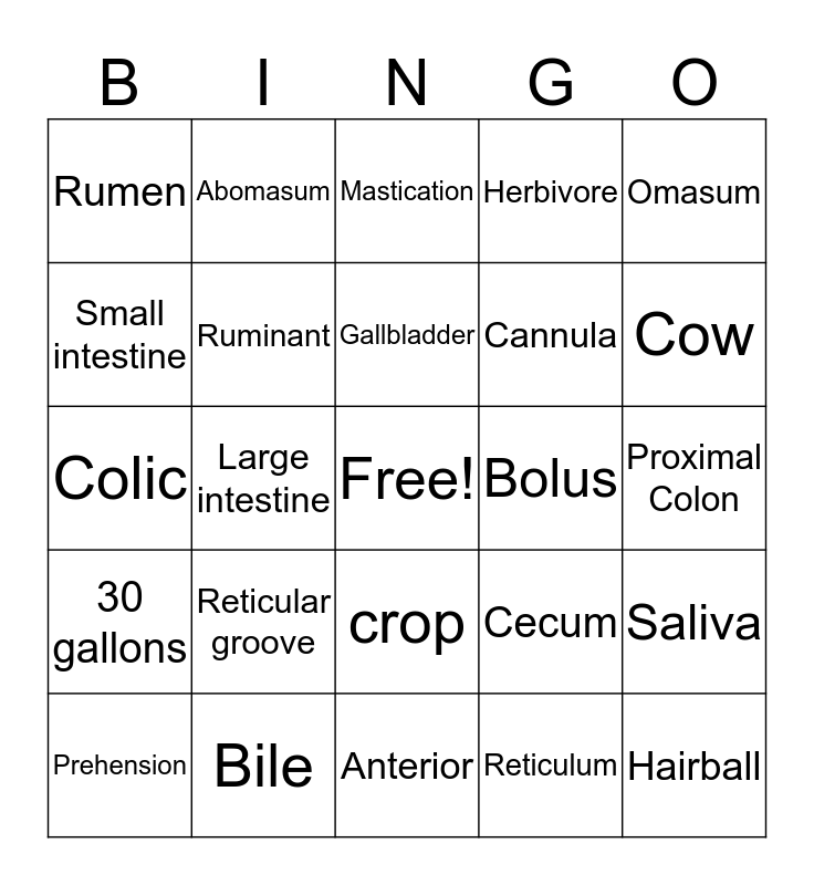 This bingo card has a free space and 24 words: Prehension, Reticular groove, Gallbladder, Reticulum, Omasum, Rumen, Abomasum, Mastication, Bolus, Proximal Colon, Colic, Ruminant, Cecum, Saliva, Small intestine, Bile, Anterior, Herbivore, Cow, 30 gallons, Large intestine, crop, Cannula and Hairball.