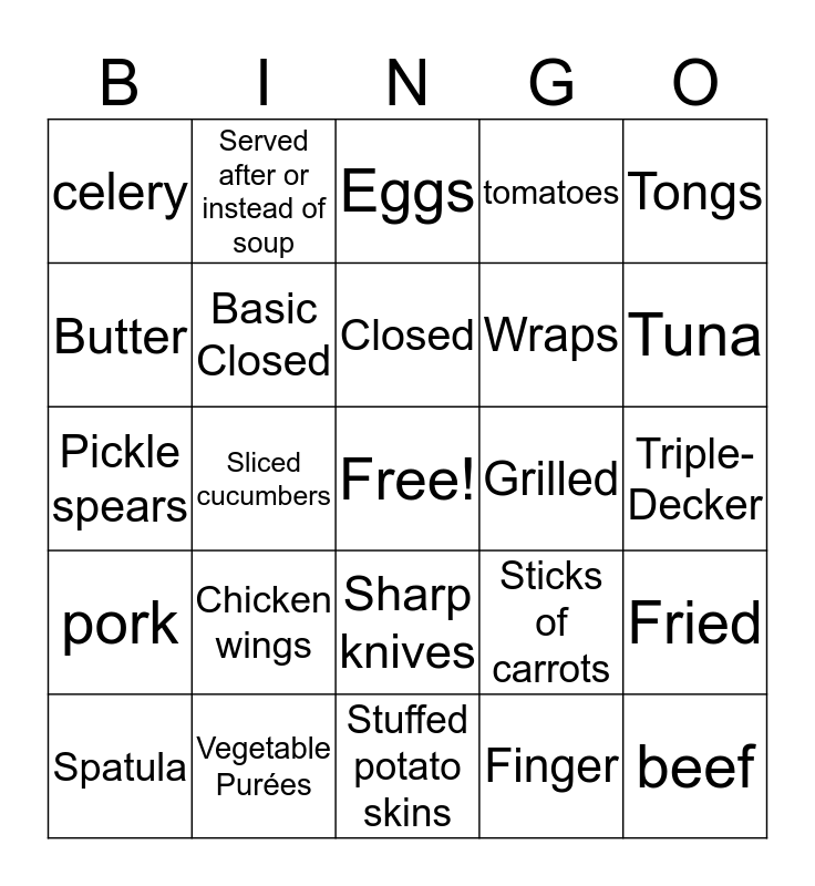 This bingo card has a free space and 35 words: Cutting board, Whole vegetables, Mayo, Basic Closed, Sharp knives, tomatoes, Butter, meats, Closed, baby spinach leaves, Pickle spears, Tongs, green or black olives, Toaster, celery, Grilled, Finger, Sliced cucumbers, pork, beef, Sticks of carrots, Spatula, Fried, Vegetable Purées, Eggs, Tuna, Cheese, Open-Face, Wraps, Triple-Decker, Meatballs, Stuffed potato skins, Chicken wings, Served after or instead of soup and Hors d’ oeuvre.
