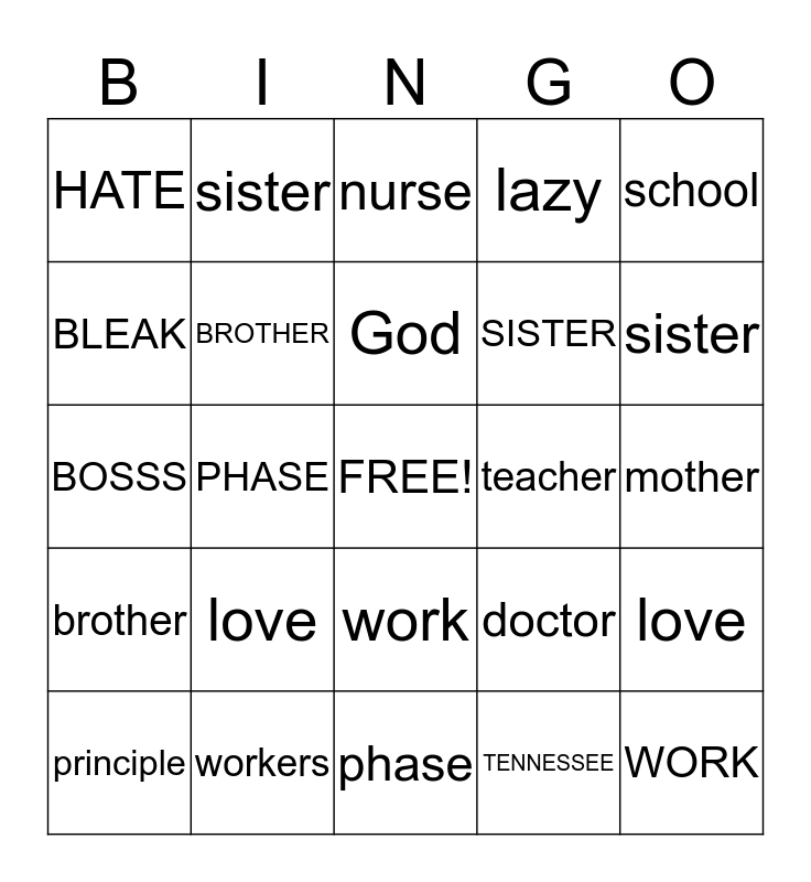This bingo card has a free space and 24 words: love, workers, God, principle, school, HATE, BLEAK, sister, teacher, work, SISTER, BOSSS, doctor, love, BROTHER, TENNESSEE, mother, nurse, sister, PHASE, WORK, brother, lazy and phase.