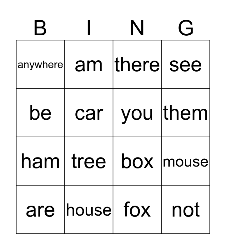 This bingo card has 16 words: house, mouse, there, anywhere, ham, am, box, fox, be, car, are, see, tree, them, you and not.