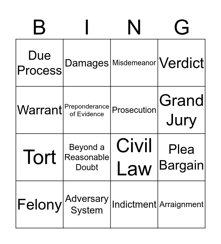 This bingo card has 16 words: Adversary System, Plea Bargain, Misdemeanor, Due Process, Tort, Damages, Civil Law, Indictment, Warrant, Preponderance of Evidence, Felony, Verdict, Beyond a Reasonable Doubt, Grand Jury, Prosecution and Arraignment.