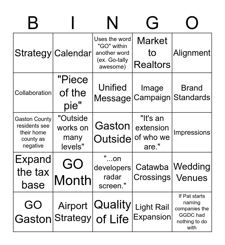 This bingo card has a free space and 24 words: GO Month, Airport Strategy, Unified Message, GO Gaston, Alignment, Strategy, Collaboration, Calendar, "It's an extension of who we are.", "...on developers radar screen.", Image Campaign, Gaston County residents see their home county as negative, Catawba Crossings, Wedding Venues, "Piece of the pie", Light Rail Expansion, Impressions, Uses the word "GO" within another word (ex. Go-tally awesome), Brand Standards, "Outside works on many levels", If Pat starts naming companies the GGDC had nothing to do with, Expand the tax base, Market to Realtors and Quality of Life.