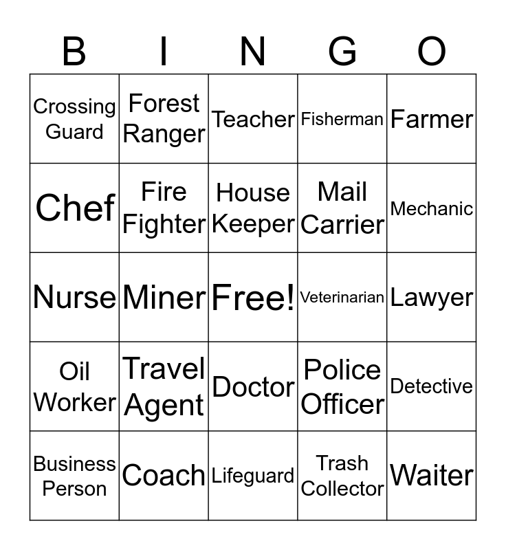 This bingo card has a free space and 24 words: Travel Agent, Coach, House Keeper, Business Person, Farmer, Crossing Guard, Chef, Forest Ranger, Veterinarian, Doctor, Mail Carrier, Nurse, Police Officer, Detective, Fire Fighter, Trash Collector, Lawyer, Teacher, Mechanic, Miner, Waiter, Oil Worker, Fisherman and Lifeguard.