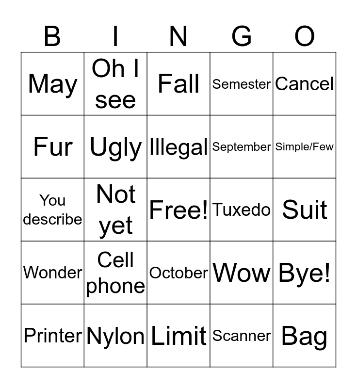 This bingo card has a free space and 131 words: February, Oh I see, Fleece, Boss, Irritate/bother, Sunglasses, Wonder, Wool, Maybe, Gold, Miss class, Grade, Look like, Above, Don’t want, Made-up, you, Scanner, Wrong, Fly/airplane take off/land, Given to, July, Bag, September, Don’t know, Winter, Something/someone, Not yet, Should not, Boss, March, Semester, Bye!, Simple/Few, Touch/been to, December, Seasons, Many, New York, Don’t do that, Summer, Illegal, Tease, Mind-stupid, Overtime, Suede, Myself/Yourself, Would you mind?, Not done, June, Polyester, None, Call, Spring, Take up (exam), Not have to, Hawaii, Rubber, Pay, Copper, Nylon, Plan, Below, All inclusive, Done/finish, Test/exam, Boots, Internet, Address, You describe, Postpone/put off, October, Hi!, Send, Inform, Not permitted, Silk, Have, Funeral, Fake, List, Waiting a long time, Different, May, Cell phone, Know that, Performance, Tuxedo, Recently, Limit, Style, Size, Through, Describing people/items/clothing, Between/middle, Reprimand/bawl out, November, Cancel, Beautiful/pretty, Fur, Borrow, Ticket, Fall, Real, Leave/left, Myself, Silver, Suit, January, Printer, Not, Ugly, Fabric, Show up, Ignore, Leather, Guess, Wallet, Refuse, Cotton, Must, Not yet, Vest, Lost, April, Plastic, Fall behind/catch up, Wow, Tell, August, None and Semester.