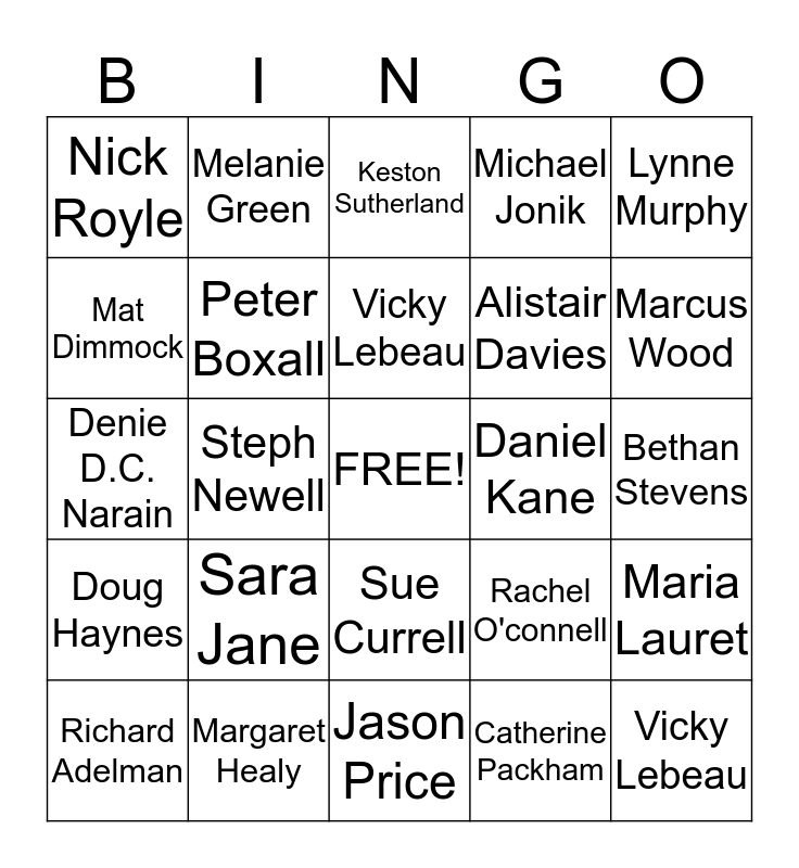 This bingo card has a free space and 24 words: Sara Jane, Margaret Healy, Vicky Lebeau, Richard Adelman, Lynne Murphy, Nick Royle, Mat Dimmock, Melanie Green, Daniel Kane, Sue Currell, Alistair Davies, Denie D.C. Narain, Rachel O'connell, Maria Lauret, Peter Boxall, Catherine Packham, Bethan Stevens, Keston Sutherland, Marcus Wood, Steph Newell, Vicky Lebeau, Doug Haynes, Michael Jonik and Jason Price.
