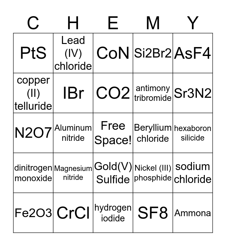 This bingo card has a free space and 34 words: PCl3, SF8, P2O10, carbon decoxide, dinitrogen monoxide, IBr, AsF4, Fe2O3, Lead (IV) chloride, Tin (VIII) sulfide, CO2, CoN, trisulfur pentoxide, P6F10, Beryllium chloride, Sr3N2, CrCl, N2O7, Magnesium nitride, Nickel (III) phosphide, Gold(V) Sulfide, Silver (I) bromide, PtS, hexaboron silicide, hydrogen iodide, Ammona, Si2Br2, CH4, antimony tribromide, copper (II) telluride, MnF8, Aluminum nitride, sodium chloride and O2.