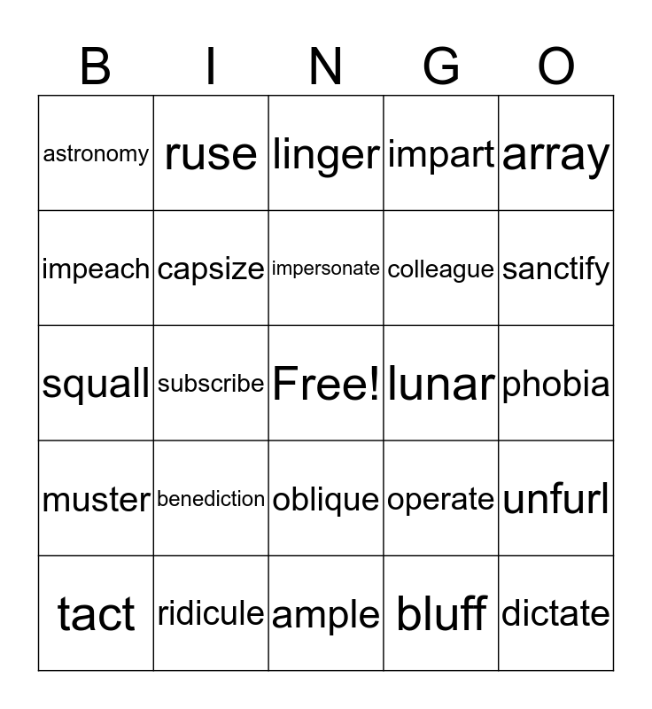 This bingo card has a free space and 24 words: benediction, ridicule, impersonate, tact, array, astronomy, impeach, ruse, lunar, oblique, colleague, squall, operate, unfurl, capsize, bluff, phobia, linger, sanctify, subscribe, dictate, muster, impart and ample.