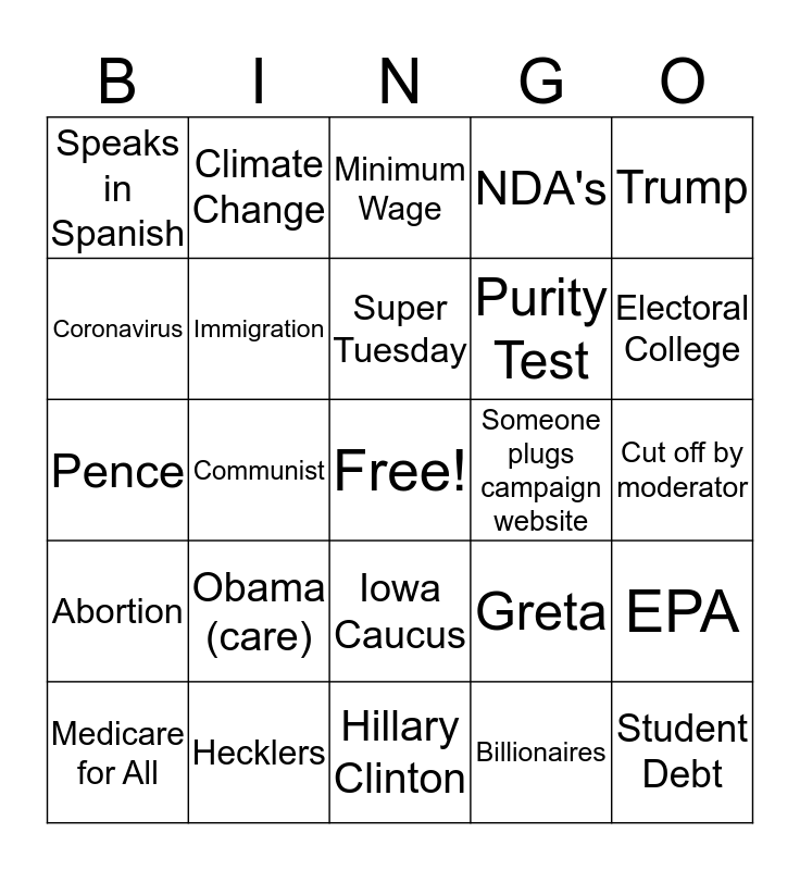 This bingo card has a free space and 29 words: Medicare for All, Russia, Communist, Marijuana, Speaks in Spanish, Minimum Wage, Immigration, Obama (care), Someone plugs campaign website, Hecklers, Cut off by moderator, Student Debt, Hillary Clinton, Billionaires, Electoral College, The DNC is rigged, Iowa Caucus, Abortion, Trump, Pence, Greta, Top 1%, Purity Test, Coronavirus, NDA's, Climate Change, EPA, Super Tuesday and Working Class.