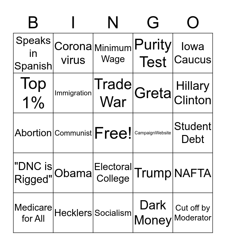 This bingo card has a free space and 29 words: Medicare for All, Russia, Communist, Marijuana, Speaks in Spanish, Minimum Wage, Immigration, Obama, CampaignWebsite, Hecklers, Student Debt, Cut off by Moderator, Socialism, Dark Money, Hillary Clinton, Billionaires, Electoral College, "DNC is Rigged", Iowa Caucus, Abortion, Trump, Pence, Greta, Top 1%, Purity Test, Corona virus, NAFTA, Trade War and Fox News.