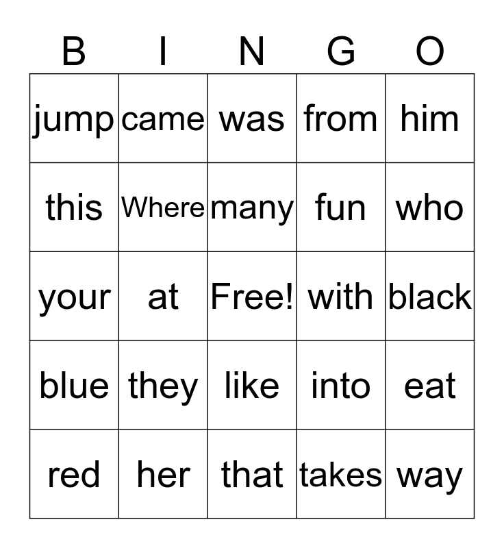 This bingo card has a free space and 24 words: they, her, many, red, him, jump, this, came, with, like, fun, your, into, eat, Where, takes, black, was, who, at, way, blue, from and that.