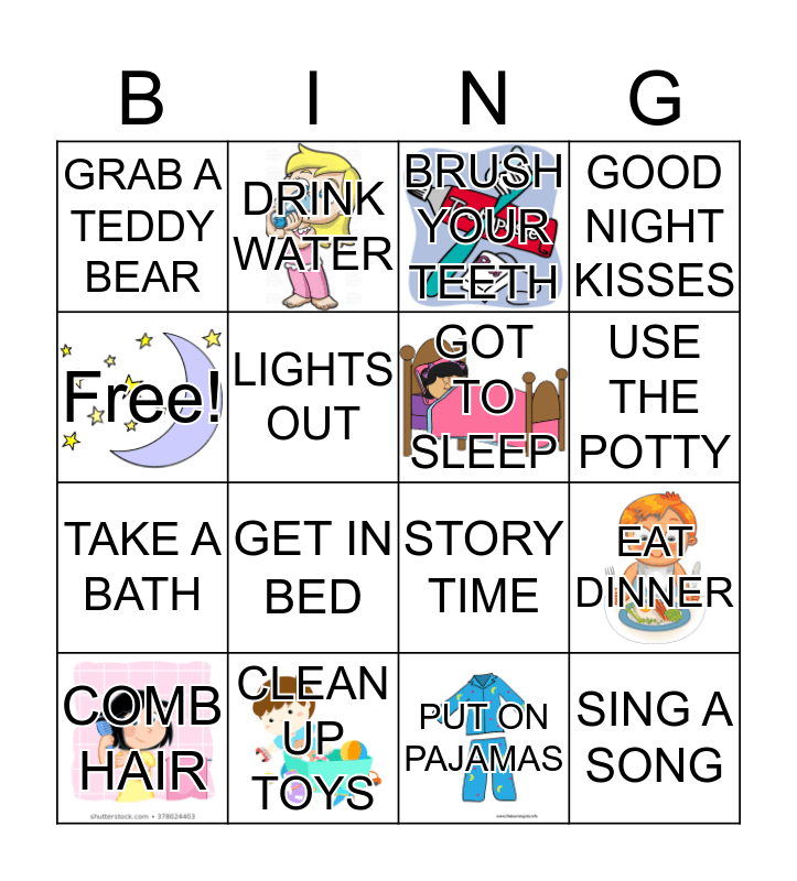 This bingo card has 8 images and 16 words: CLEAN UP TOYS, EAT DINNER, BRUSH YOUR TEETH, GRAB A TEDDY BEAR, TAKE ABATH, DRINK WATER, STORY TIME, PUT ON PAJAMAS, Free!, LIGHTS OUT, COMB HAIR, GOOD NIGHT KISSES, GET IN BED, USE THE POTTY, GOT TO SLEEP and SING A SONG.