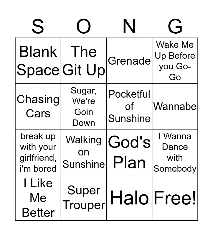 This bingo card has 131 words: Wait a Minute!, The Git Up, Eyes. Lips. Face., Dance Monkey, Yellow Hearts, Hate Me, Free!, My Friends, Break My Stride, Mamma Said, Tusa, Maniac, Circles, What A Man Gotta Do, death bed, ON, My Oh My, i'm so tired..., Location, Lover, If I Can't Have You, I Like Me Better, break up with your girlfriend, i'm bored, Sucker, Love Lies, Dancing Queen, I Wanna Dance with Somebody, The Greatest Show, Billie Jean, Buy U a Drank, Wake Me Up Before you Go-Go, Mamma Mia, Walking on Sunshine, The Time of My Life, Don't Stop the Music, Another Day of Sun, Africa, Take on Me, Sweet Dreams, Truth Hurts, Wannabe, Don't Stop Believin', Stayin' Alive, Livin' on a Prayer, Gasolina, Livin' la Vida Loca, Waving Through a Window, Uptown Girl, I Want it That Way, Candy Shop, You're the One I Want, Yeah!, Get Low, Cake By the Ocean, Hollaback Girl, Juice, Low, Blinding Lights, Don't Start Now, Say So, Physical, Sunday best, bad guy, bury a friend, Rare, No Diggity, Boy With Luv, SICKO MODE, God's Plan, DNA, Walk it Talk it, Magic In The Hamptons, Riptide, Tonight Tonight, I Fall Apart, Wildest Dreams, Classic, Ain't It Fun, no tears left to cry, Dangerous Woman, thank u, next, Stolen Dance, Blank Space, FourFiveSeconds, Teenage Dream, Come on Eileen, Super Trouper, I'm Coming Out, Material Girl, Crazy Little Thing Called Love, Whip It, It's Raining Men, No Scrubs, Say My Name, Santeria, Umbrella, Chasing Cars, Since U Been Gone, Sugar, We're Goin Down, Fergalicious, Hey Ya!, Grenade, Super Bass, The Lazy Song, I Gotta Feeling, The Climb, Halo, LoveGame, Party In The U.S.A., Womanizer, Pocketful of Sunshine, TiK ToK, Hey, Soul Sister, Love The Way You Lie, You Make My Dreams, Never Gonna Give You Up, Sk8er Boi, This Love, Yellow, Mr. Brightside, Rich Girl, Survivor, I Want it That Way, Pump It, Crazy in Love, I Write Sins Not Tragedies, Pon de Replay, Oops!...I Did it Again, Toxic, Uptown Girl and Out of My League.