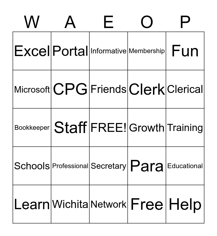 This bingo card has a free space and 25 words: Professional, Network, Friends, Learn, Fun, Excel, Microsoft, Portal, Growth, Secretary, Clerk, Bookkeeper, Para, Educational, CPG, Inservice, Training, Informative, Clerical, Staff, Help, Wichita, Schools, Membership and Free.