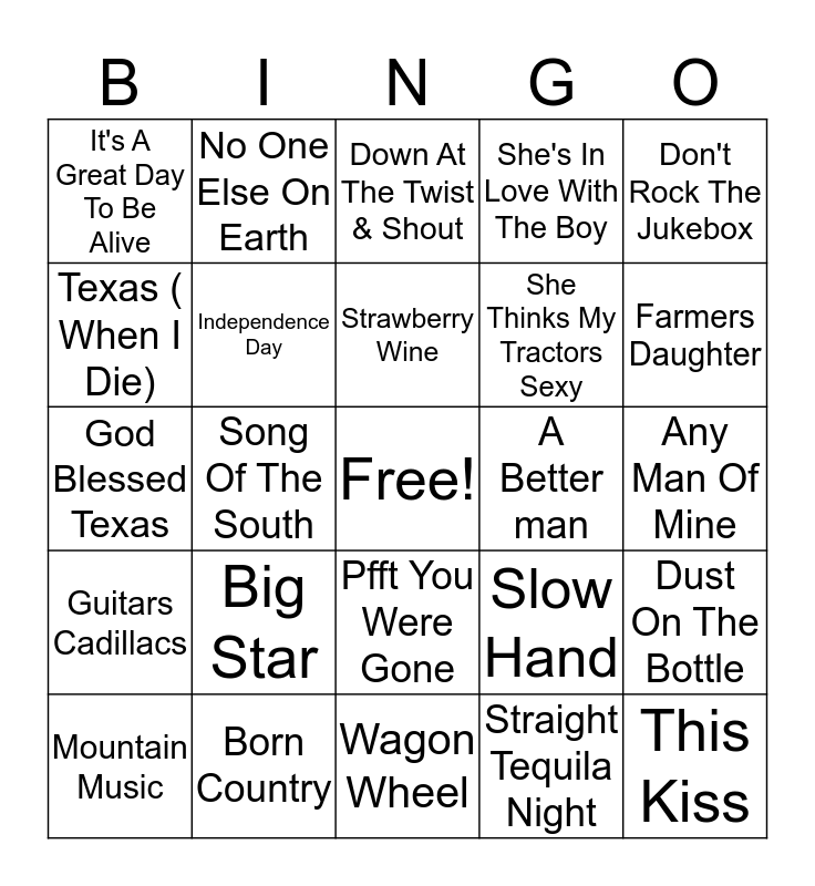 This bingo card has a free space and 55 words: Devil Went Down To Georgia, Mountain Music, Play It Again, It's A Great Day To Be Alive, Wagon Wheel, Fancy, Independence Day, Something Like That, She Thinks My Tractors Sexy, Good Directions, She's In Love With The Boy, Little bitty, Suds In The Bucket, Stay, Toes, Deeper Than The Holler, Don't Rock The Jukebox, Song Of The South, All My Rowdy Friends Have Settled Down, This Kiss, A Better man, What Was I Thinkin', Slow Hand, Down At The Twist & Shout, Sold ( The Grundy County Auction), Strawberry Wine, Straight Tequila Night, Gimme That Girl, Any Man Of Mine, Dust On The Bottle, Country Girl Shake It For me, Real Good man, All My Friends Say, It's A Little Too late, Texas ( When I Die), God Blessed Texas, Whose Beds Have Your Boots Been Under, Guitars Cadillacs, Girl Crush, Mercury Blues, No One Else On Earth, Alcohol, The Race Is On, Indian Outlaw, Big Star, Born Country, I'm Gonna Hire A Wino To Decorate Out Home, Before he Cheats, Ol' Red, Farmers Daughter, I Love This Bar, Red Solo Cup, The First Redneck On The Internet, Pfft You Were Gone and Older Women.
