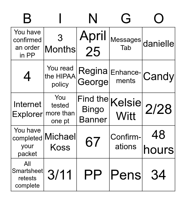 This bingo card has a free space and 29 words: All Smartsheet retests complete, You put in >1 smartsheet issue, You tested more than one pt, Color this square in, You have confirmed an order in PP, April 25, You read the HIPAA policy, Michael Koss, Kelsie Witt, 3/11, 2/28, 34, PP, Pens, Candy, Yoda, 67, You have completed your packet, danielle, Internet Explorer, Confirm-ations, Ashayla, Enhance-ments, 4, Messages Tab, 3 Months, 48 hours, Regina George and Glen Coco.