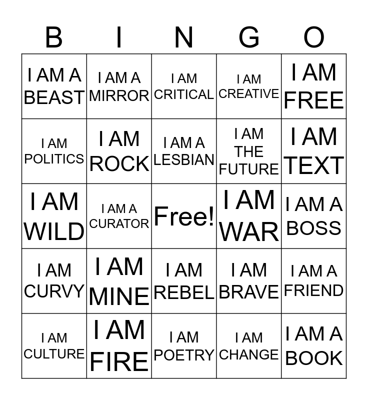 This bingo card has a free space and 34 words: I AM AN ARTIST, I AM CHANGE, I AM HISTORY, I AM A FEMINIST, I AM CURVY, I AM ROCK, I AM FREE, I AM CULTURE, I AM A MIRROR, I AM A WRITER, I AM A LESBIAN, I AM CRITICAL, I AM A WARRIOR, I AM TRANS, I AM WAR, I AM TEXT, I AM FIRE, I AM WILD, I AM MINE, I AM BRAVE, I AM REBEL, I AM EQUALITY, I AM A BEAST, I AM A BOSS, I AM POETRY, I AM A BOOK, I AM CREATIVE, I AM JUSTICE, I AM THE FUTURE, I AM POLITICS, I AM YOUR SISTER, I AM A CURATOR, I AM A FRIEND and I AM A GIRLFRIEND.
