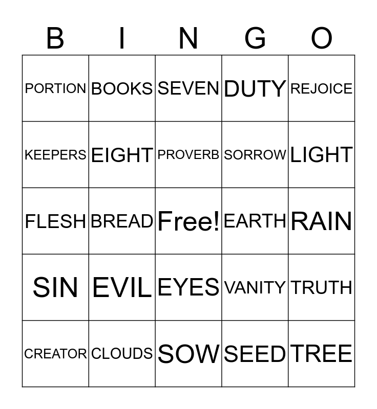 This bingo card has a free space and 29 words: CREATOR, YOUTH, BREAD, DAYS, PORTION, SEVEN, EIGHT, EVIL, EARTH, CLOUDS, RAIN, TREE, SOW, SEED, LIGHT, SWEET, EYES, SIN, REJOICE, FLESH, VANITY, REMOVE, SORROW, KEEPERS, DUTY, BOOKS, TRUTH, PROVERB and DUST.