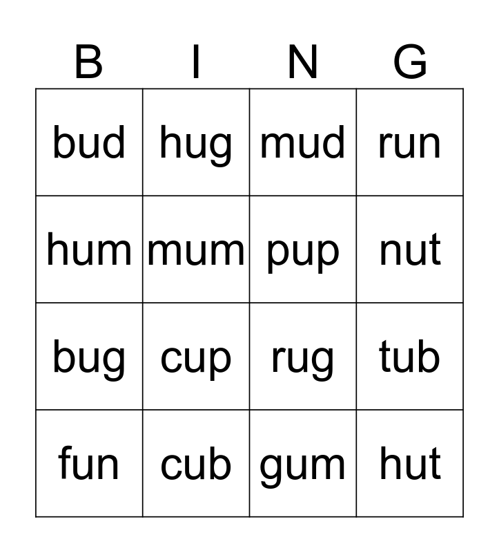 This bingo card has 16 words: cub, tub, mud, bud, bug, hug, rug, gum, hum, mum, fun, run, cup, nut, pup and hut.