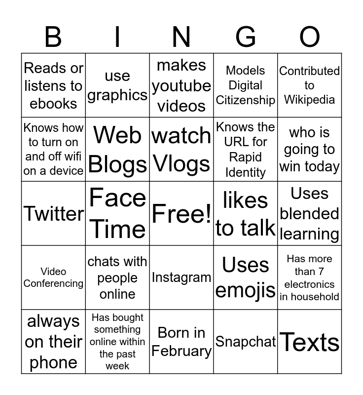 This bingo card has a free space and 32 words: Snapchat, Facebook, Face Time, iPhone, Video Conferencing, Web Blogs, Contributed to Wikipedia, Has more than 7 electronics in household, use graphics, some who make Tik Tok's, watch Vlogs, makes youtube videos, makes lesson plans, Future Educator, likes to talk, really quite, always on their phone, Twitter, Instagram, chats with people online, Uses emojis, Uses hashtags, Uses blended learning, Has bought something online within the past week, Texts, Models Digital Citizenship, Knows the URL for Rapid Identity, Knows how to turn on and off wifi on a device, Reads or listens to ebooks, Born in February, loves math and who is going to win today.