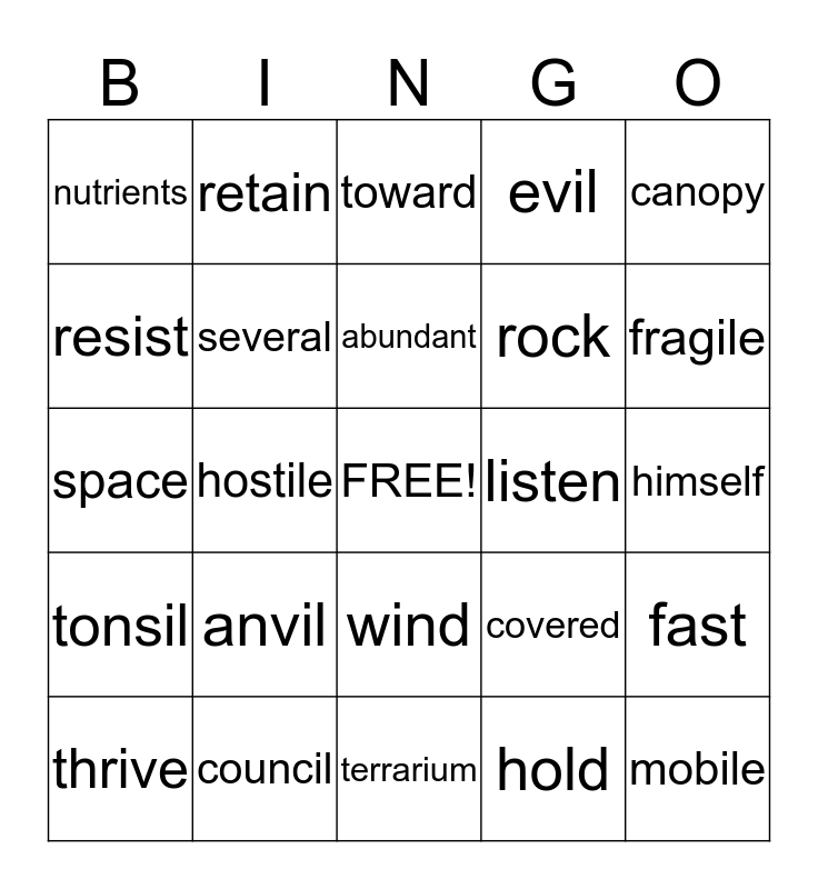 This bingo card has a free space and 24 words: anvil, council, abundant, thrive, canopy, nutrients, resist, retain, listen, wind, rock, space, covered, fast, several, hold, himself, toward, fragile, hostile, mobile, tonsil, evil and terrarium.
