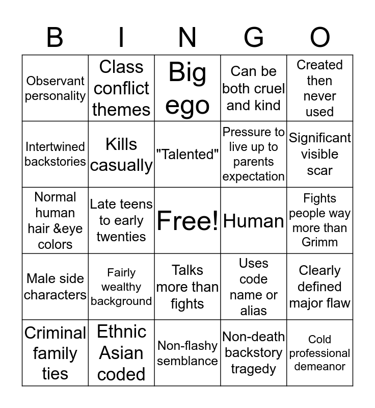This bingo card has a free space and 29 words: Criminal family ties, Delinquent visual theme, Late teens to early twenties, Simple weapon design, Observant personality, Big ego, Kills casually, Fairly wealthy background, Human, Ethnic Asian coded, Fights people way more than Grimm, Cold professional demeanor, Non-flashy semblance, Non-death backstory tragedy, Significant visible scar, Angsty RP plots, Talks more than fights, Male side characters, Created then never used, Normal human hair &eye colors, Uses code name or alias, Decently attractive but not hot, Pressure to live up to parents expectation, Intertwined backstories, Can be both cruel and kind, Class conflict themes, Clearly defined major flaw, "Talented" and Random hobbies.