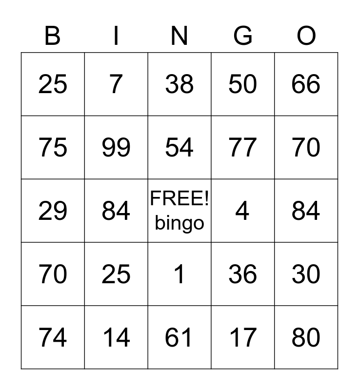 This bingo card has a free space and 24 words: 25, 14, 54, 74, 66, 25, 75, 7, 4, 1, 77, 29, 36, 30, 99, 17, 84, 38, 70, 84, 80, 70, 50 and 61.