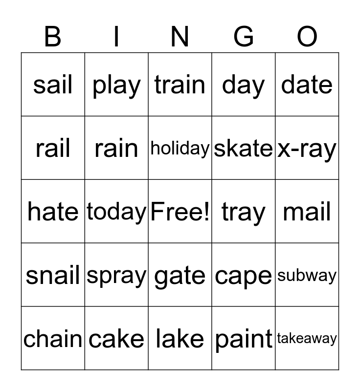 This bingo card has a free space and 24 words: spray, cake, holiday, chain, date, sail, rail, play, tray, gate, skate, hate, cape, subway, rain, paint, mail, train, x-ray, today, takeaway, snail, day and lake.