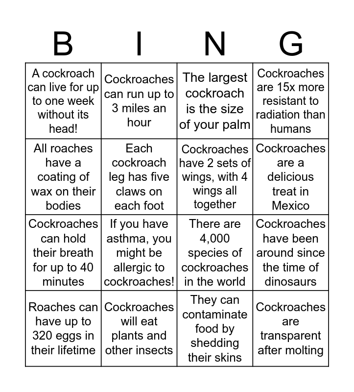 This bingo card has 16 words: Cockroaches will eat plants and other insects, Cockroaches have been around since the time of dinosaurs, The largest cockroach is the size of your palm, A cockroach can live for up to one week without its head!, Cockroaches can hold their breath for up to 40 minutes, Cockroaches can run up to 3 miles an hour, There are 4,000 species of cockroaches in the world, They can contaminate food by shedding their skins, All roaches have a coating of wax on their bodies, Each cockroach leg has five claws on each foot, Roaches can have up to 320 eggs in their lifetime, Cockroaches are 15x more resistant to radiation than humans, If you have asthma, you might be allergic to cockroaches!, Cockroaches are a delicious treat in Mexico, Cockroaches have 2 sets of wings, with 4 wings all together and Cockroaches are transparent after molting.