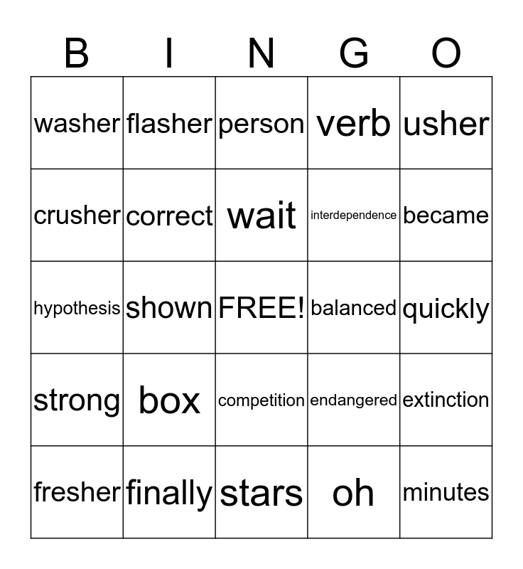 This bingo card has a free space and 24 words: box, finally, wait, fresher, usher, washer, crusher, flasher, balanced, competition, interdependence, hypothesis, endangered, extinction, correct, oh, quickly, person, became, shown, minutes, strong, verb and stars.