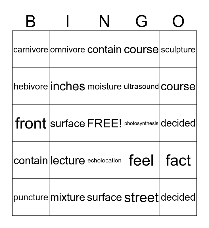 This bingo card has a free space and 24 words: lecture, mixture, moisture, puncture, sculpture, carnivore, hebivore, omnivore, photosynthesis, echolocation, ultrasound, front, feel, fact, inches, street, decided, contain, course, surface, decided, contain, course and surface.