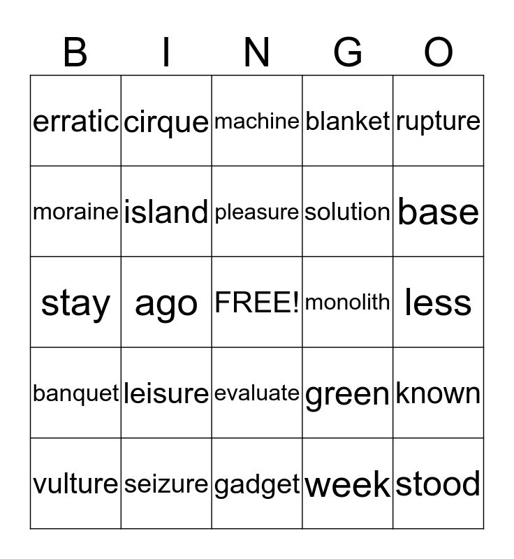 This bingo card has a free space and 24 words: leisure, seizure, pleasure, vulture, rupture, erratic, moraine, cirque, monolith, evaluate, solution, stay, green, known, island, week, less, machine, base, ago, stood, banquet, blanket and gadget.