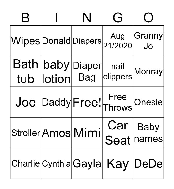 This bingo card has a free space and 44 words: Bottle, DeDe, Bobbie, Charlie, Pink Toes, Kay, Diapers, Deontae, Granny Jo, Cynthia, Aug 21/2020, Free Throws, Mimi, Amos, Howard, Gayla, Cuddle, Joe, Booties, Monray, Donald, Bassinet, Blanket, Wipes, Pacifier, Onesie, Formula, Crib, Car Seat, Stroller, Walker, Baby names, Hospital, Mommy, Daddy, Burp, Spit up, Comb & Brush, Diaper Bag, Bath tub, nail clippers, bib, baby lotion and bottle brush.